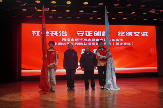 在悠扬的古筝表演《市集》后,活动进入意义非凡的授旗仪式环节。新乡市疾病预防控制中心副主任付惠成、性病艾滋病防治科科长于贺军分别为河南省百千万志愿者高校艾防宣传志愿服务队和全国大学生预防艾滋病知识竞赛(新乡赛区)志愿者代表授予队旗。接过队旗,便是接过了责任;扛起旗帜,便要扛起使命。随着队旗的交接,全国大学生预防艾滋病知识竞赛(新乡赛区)正式启动,现场掌声雷动,共同见证这一光荣时刻。